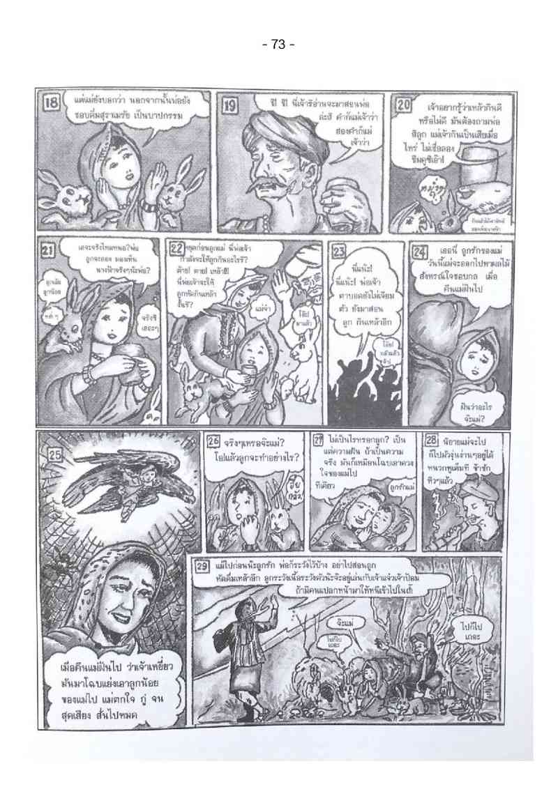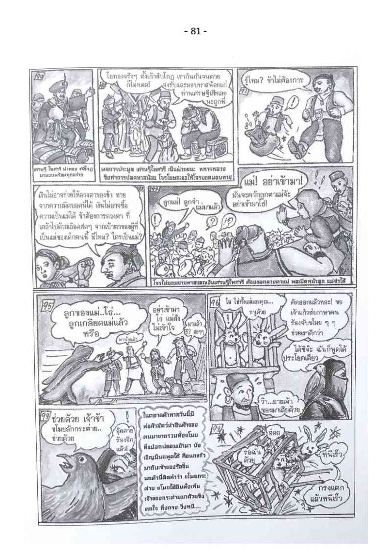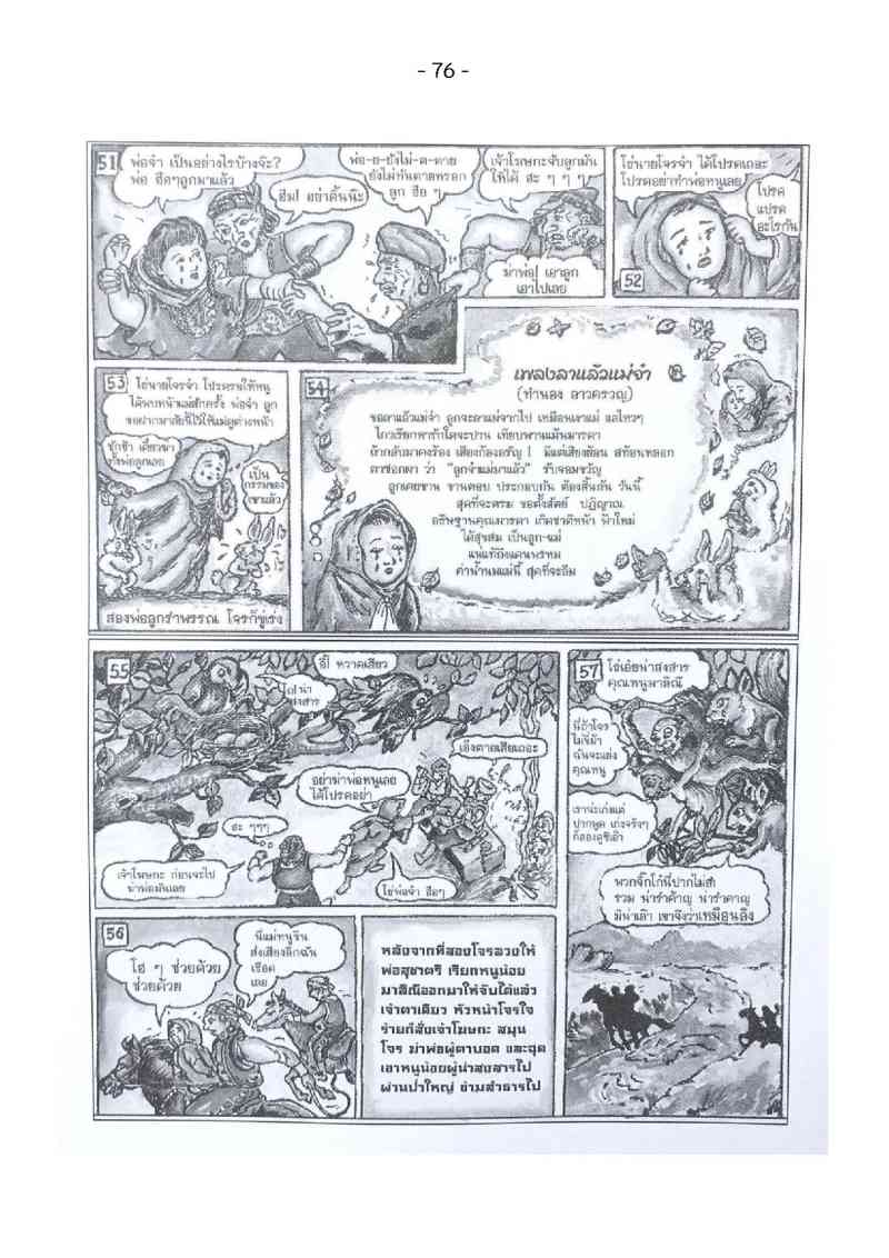 แม่ไปก่อนน๊ะลูกรัก พ่อก็ระวังไว้บ้าง อย่าไปสอนลูกหัดดื่มเหล้าอีก ลูกระวังเนื้อระวังตัวน๊ะจ๊ะ อยู่เล่นกับเจ้าแจ๋วเจ้าป้อม ถ้ามีคนแปลกหน้ามา ให้หนีเข้าไปในถ้ำ |